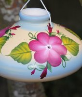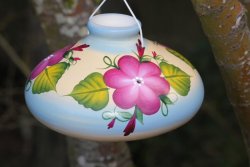 We are proud to sell these beautiful one of a kind Hummingbird feeders made in the United States: Each feeder is poured, fired and hand painted in New Mexico. Local artists take pride in painting each by hand, one at a time. They are not mass produced. The inside is glazed and fired to ensure durability and easy cleaning.